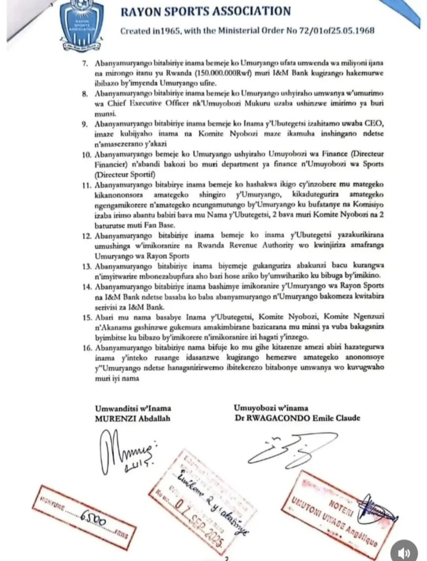 Ku Cyumweru, tariki ya 7 Nzeri 2025, habaye inama y’inteko rusange ya Rayon Sports, imyanzuro yayo ikaba yashyizwe hanze ku wa Mbere tariki ya 8 Nzeri 2025.